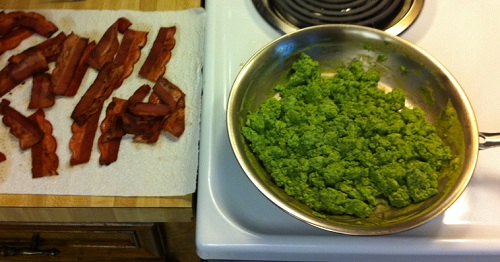 There are a variety of ways to cook and season it, but I opted for the time-saving simplicity of microwave cooking. I cut it in half length-wise, scooped out the soft middle section that contained the seeds, placed it open side down in a baking dish with 1/2 cup of water, and covered it with plastic wrap. I then cooked it on high in the microwave for 10 minutes. When it was finished I let it cool long enough to be handled and then scooped out the spaghetti-like meat with a fork. I mixed it in a bowl with a bit of heart-healthy margarine, garlic salt, pepper, and parmesan cheese. As you’ll quickly discover if you google “Spaghetti Squash,” there are MANY ways to prepare it. You just have to find something that inspires you. I served it with steamed peas and sautéed mushrooms and onions on the side. It was a lovely and fresh vegetarian meal requiring VERY little effort.