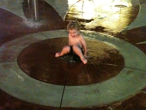 Our first time this summer to play in the awesome fountain at the shopping center where Daddy works. It was twilight and the weather was still beautiful for it. He had such a good time!